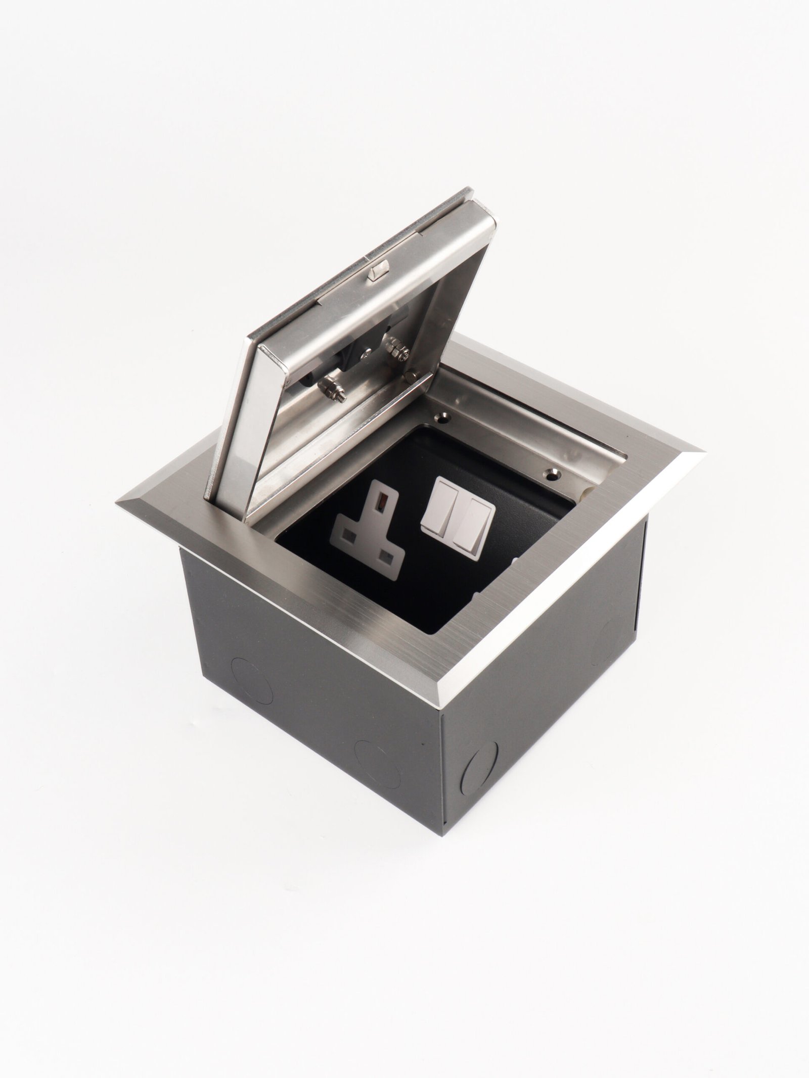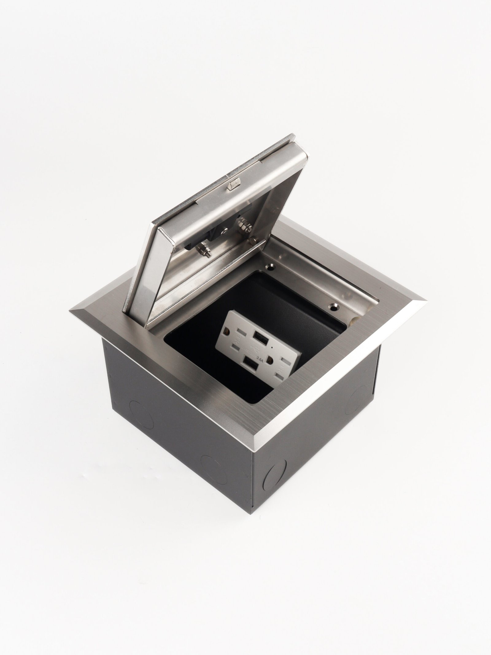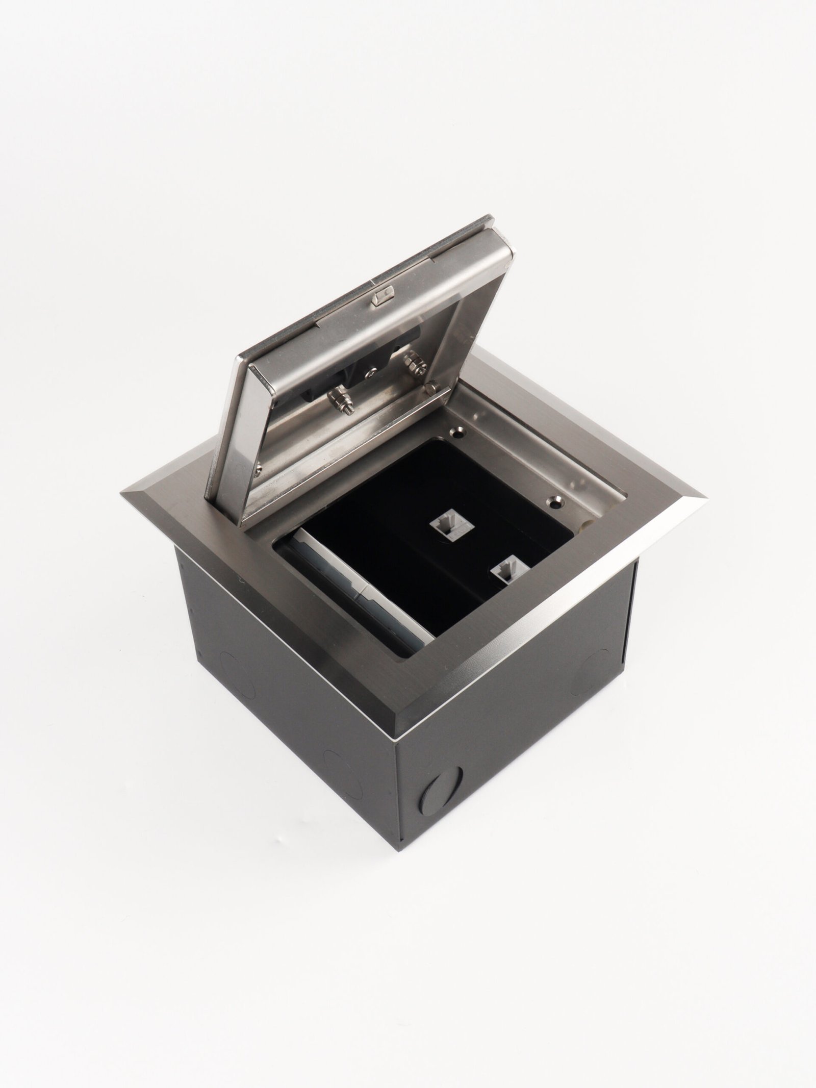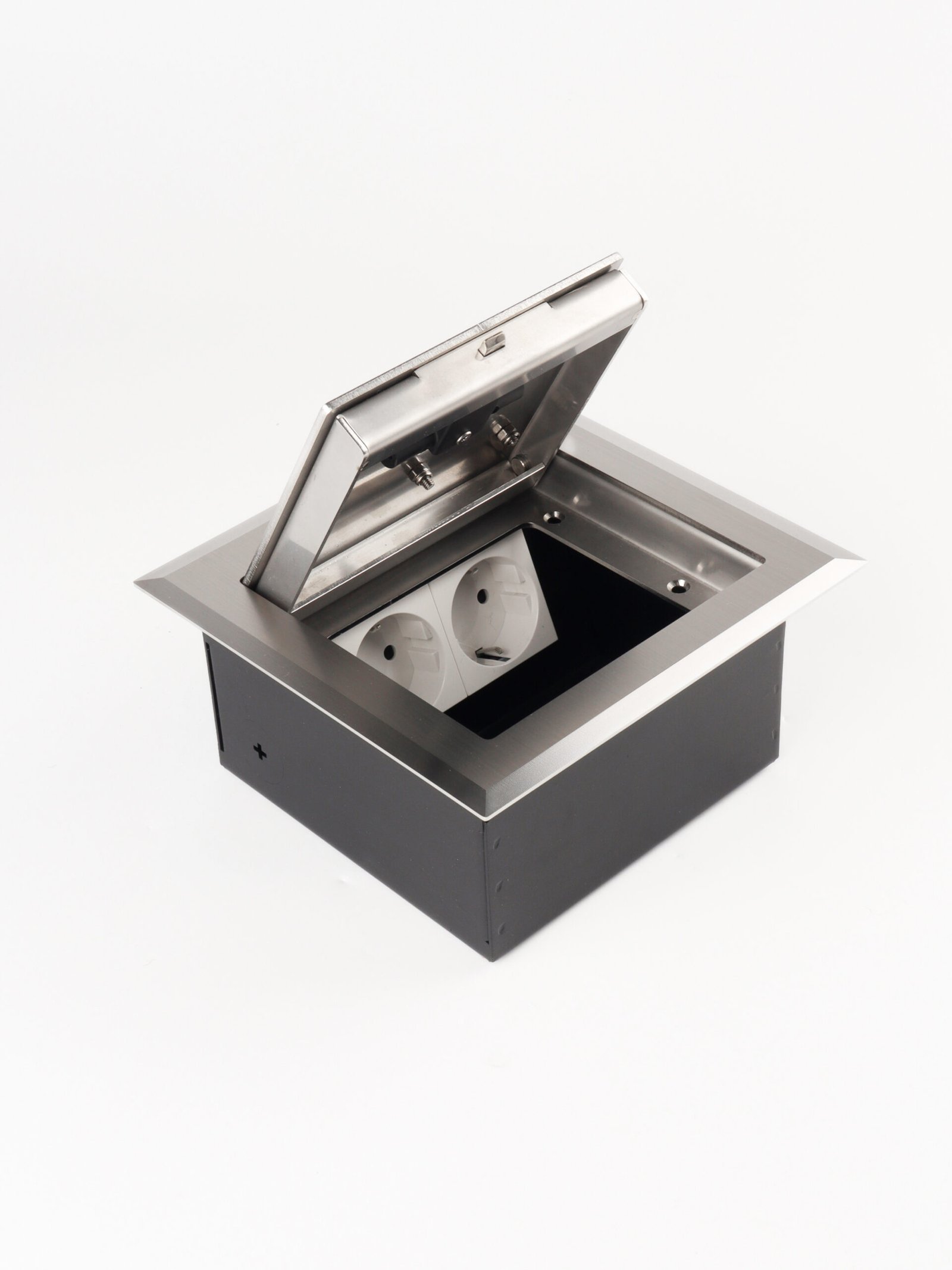The floor box features a soft-closing lid with a stay-open function at any angle, designed with an intelligent opening mechanism for smooth and safe operation. It comes with a self-bouncing “D” handle integrated into the cord outlet, combined with a self-locking system to ensure secure opening and closing. For added flexibility, the cord outlet is also available with a durable wire handle option.