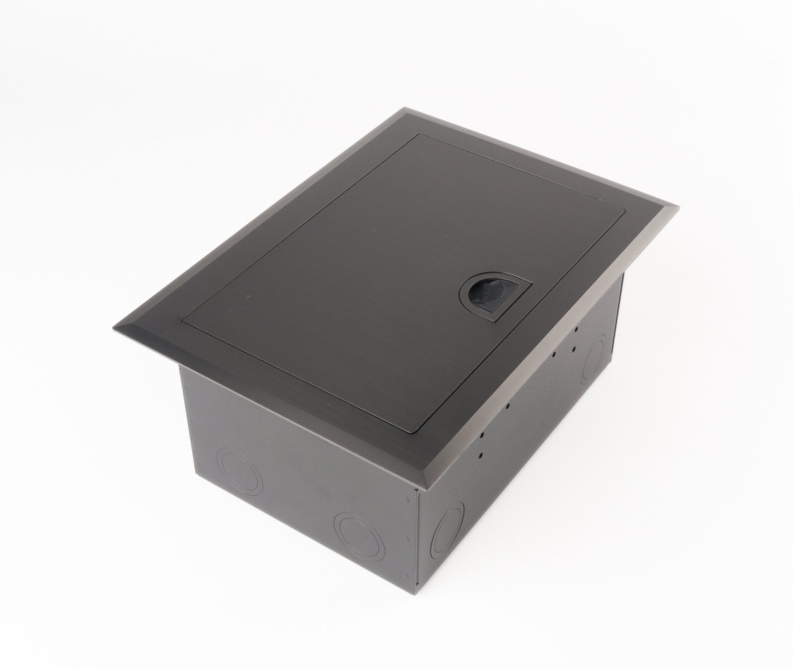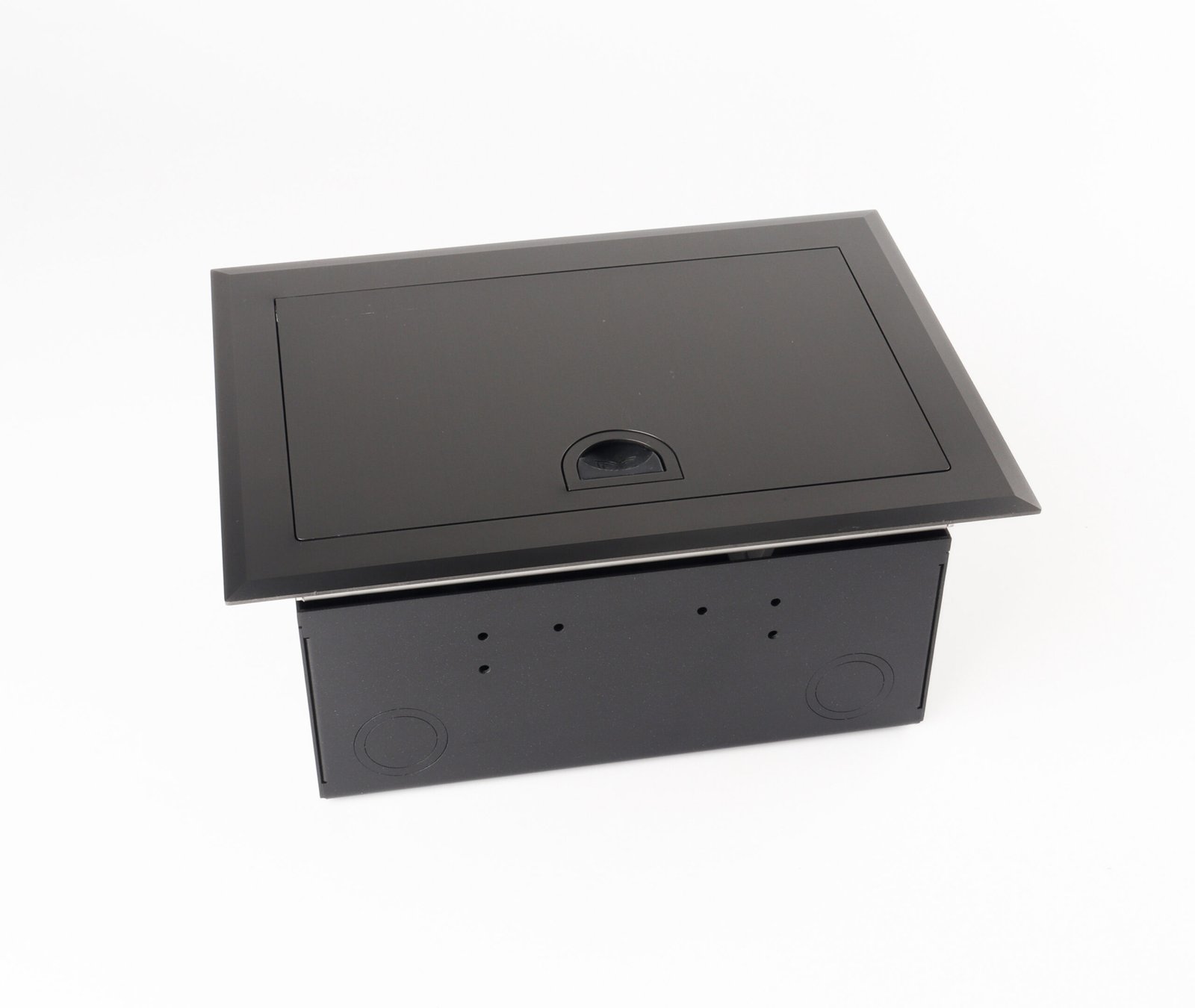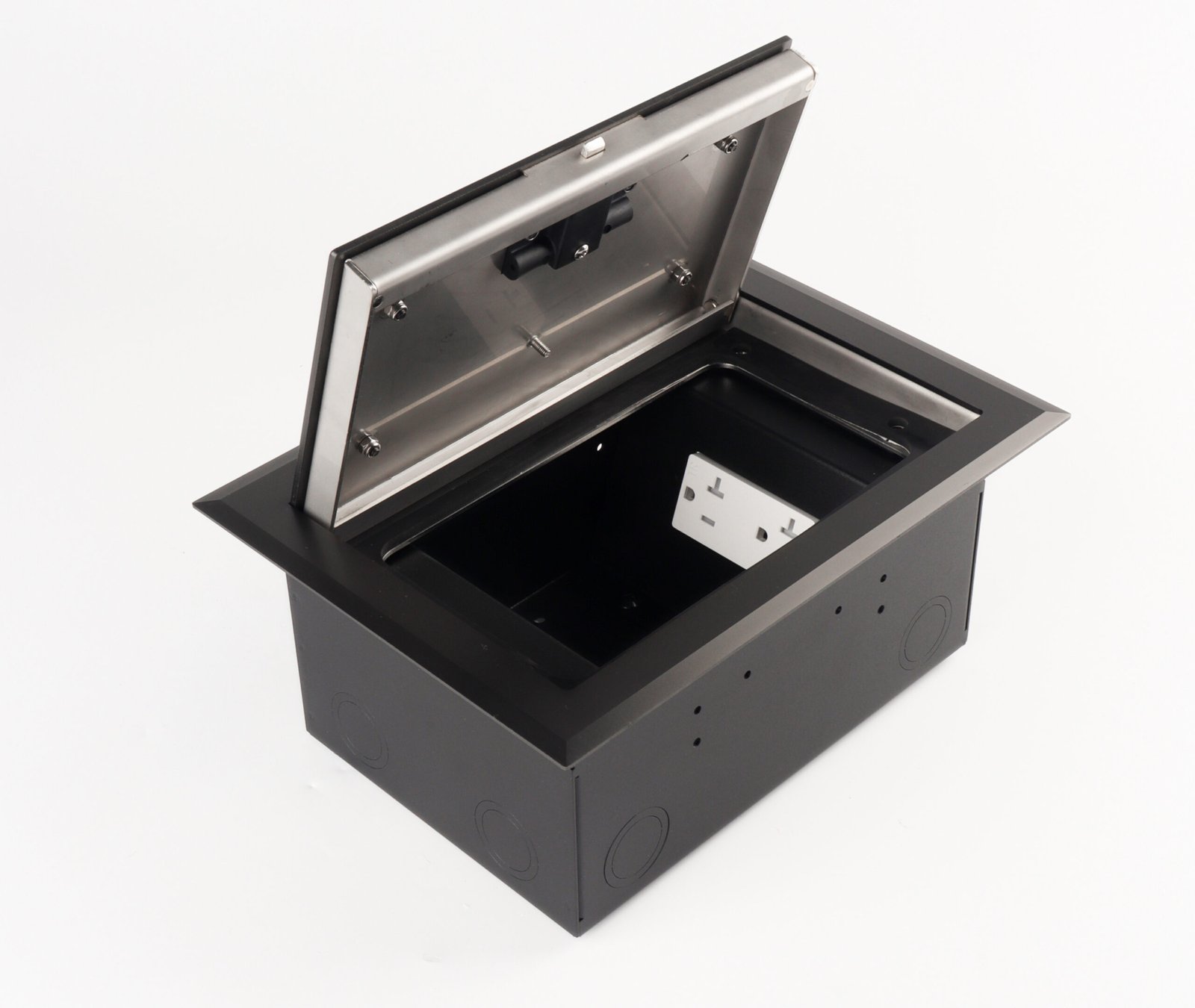 The floor box features a soft-closing lid with a stay-open function at any angle, designed with an intelligent opening mechanism for smooth and safe operation. It comes with a self-bouncing “D” handle integrated into the cord outlet, combined with a self-locking system to ensure secure opening and closing. For added flexibility, the cord outlet is also available with a durable wire handle option.