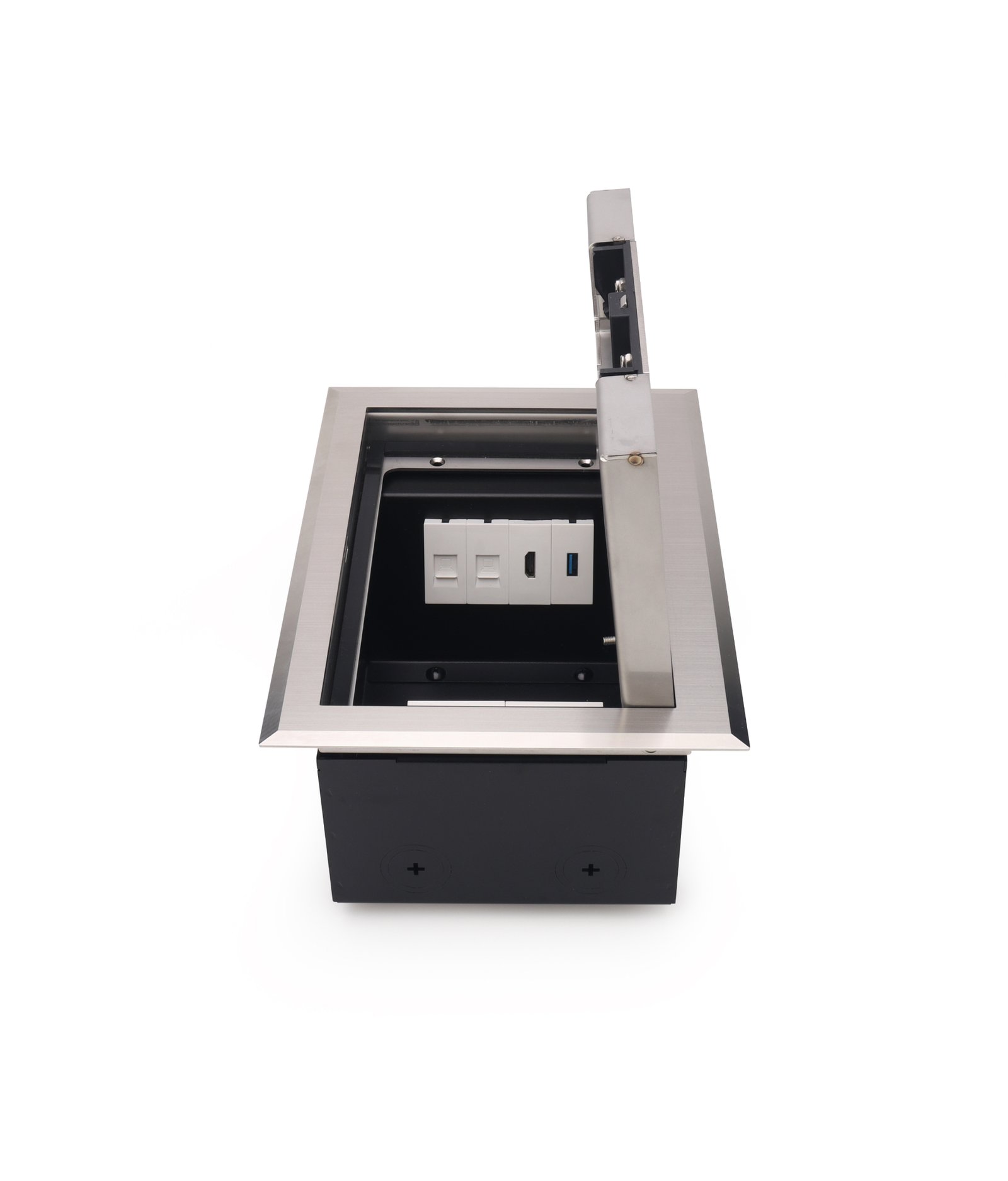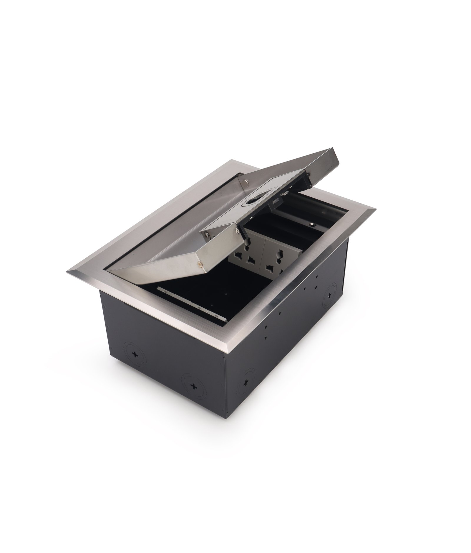 The FR series floor boxes feature an attractive stainless steel design with protection frame. The deep recessed cover, crafted from brushed stainless steel, stays open at any angle for easy access. With their build in sleek finish and durable construction, these floor boxes stand out for their premium quality and modern appearance. Integrated with the self-bouncing “D” handle works in tandem with a reliable self-locking system to ensure stable opening and closing. Additionally , FR-O Series offers the perfect solution with its flip-up cord outlet and self-locking mechanism, designed to meet the needs of convenient power access for indoor venues.