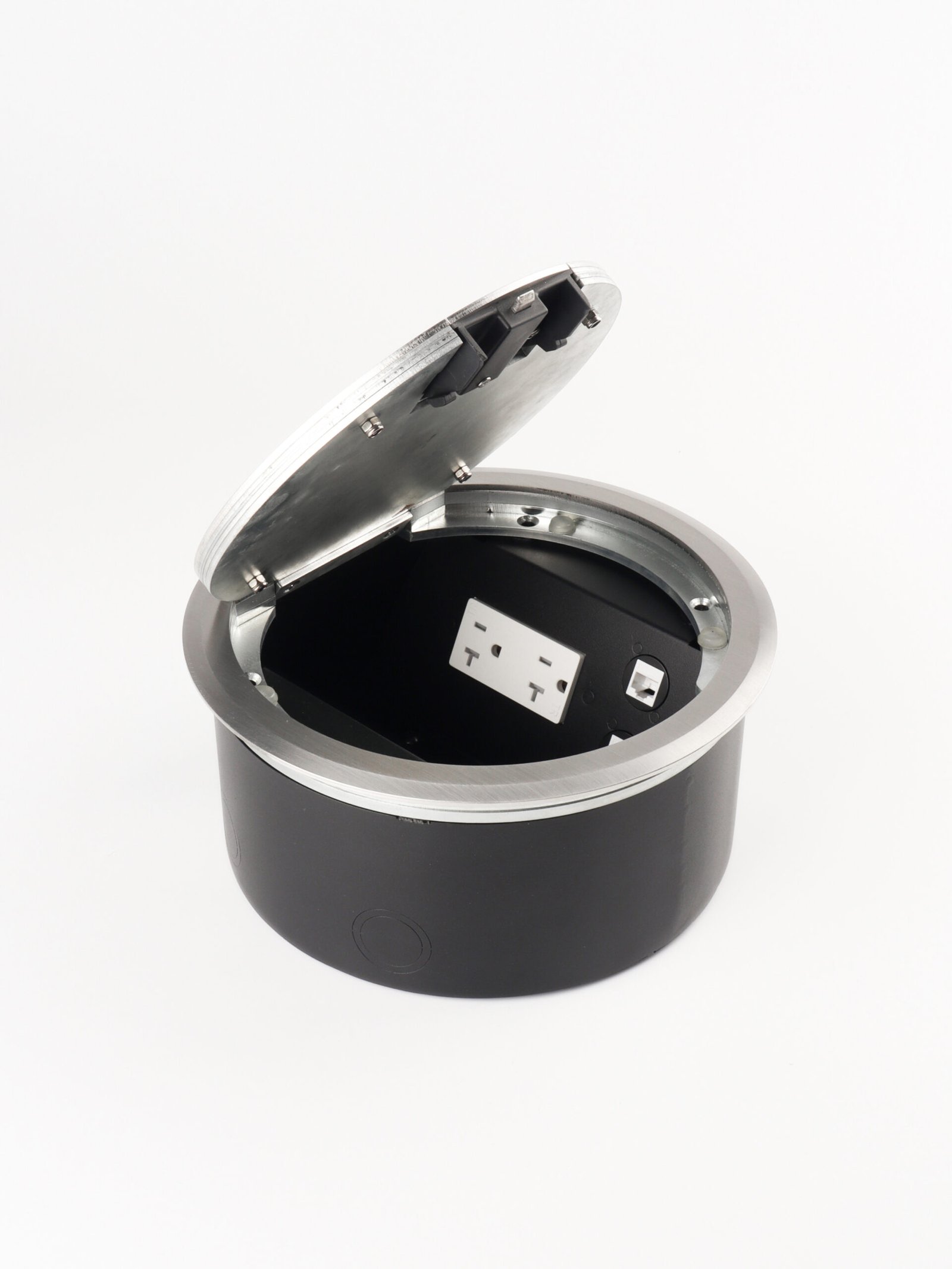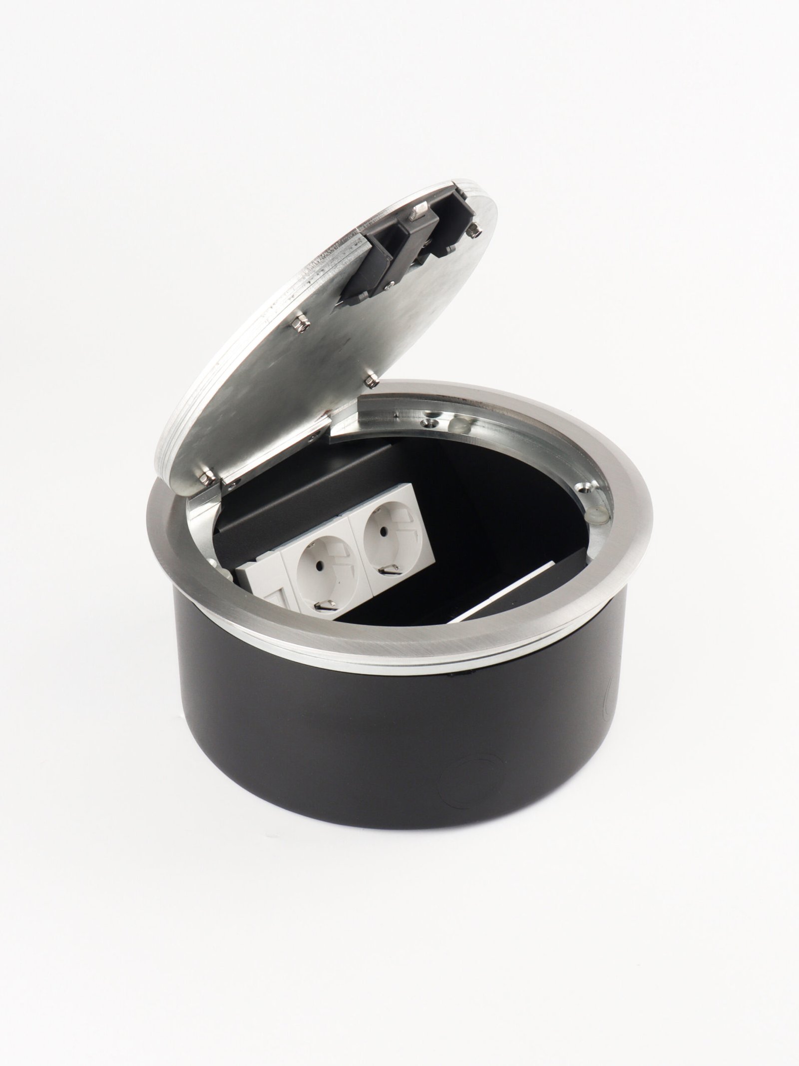 Designed for installation in concrete, wood, or raised floors, the floor box offers durable protection, smooth cable management, and a flush, discreet appearance, making it the ideal solution for both commercial and residential spaces.
