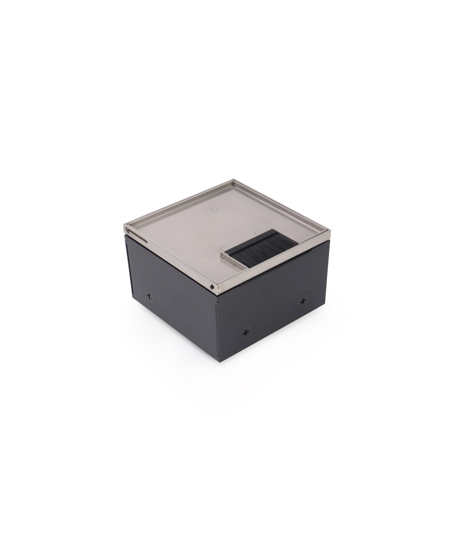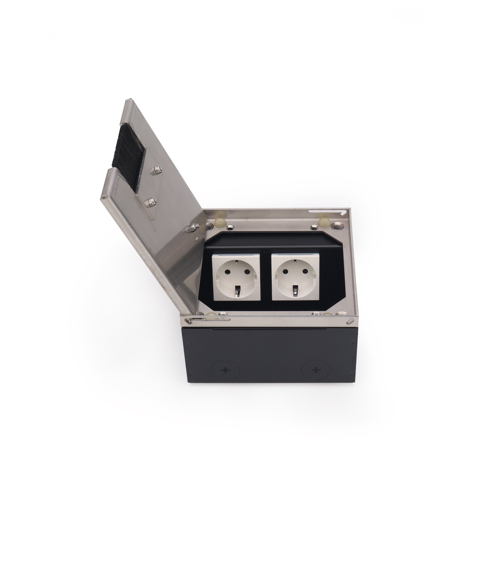 The height-adjustable floor box can be precisely aligned with the finished floor surface, ensuring a seamless flush installation. Its lid can be fully detached from the outer frame for easy access. With its complete flush design, this floor box discreetly supports the installation of power, data, and multimedia modules, making it an ideal choice for modern and professional environments.