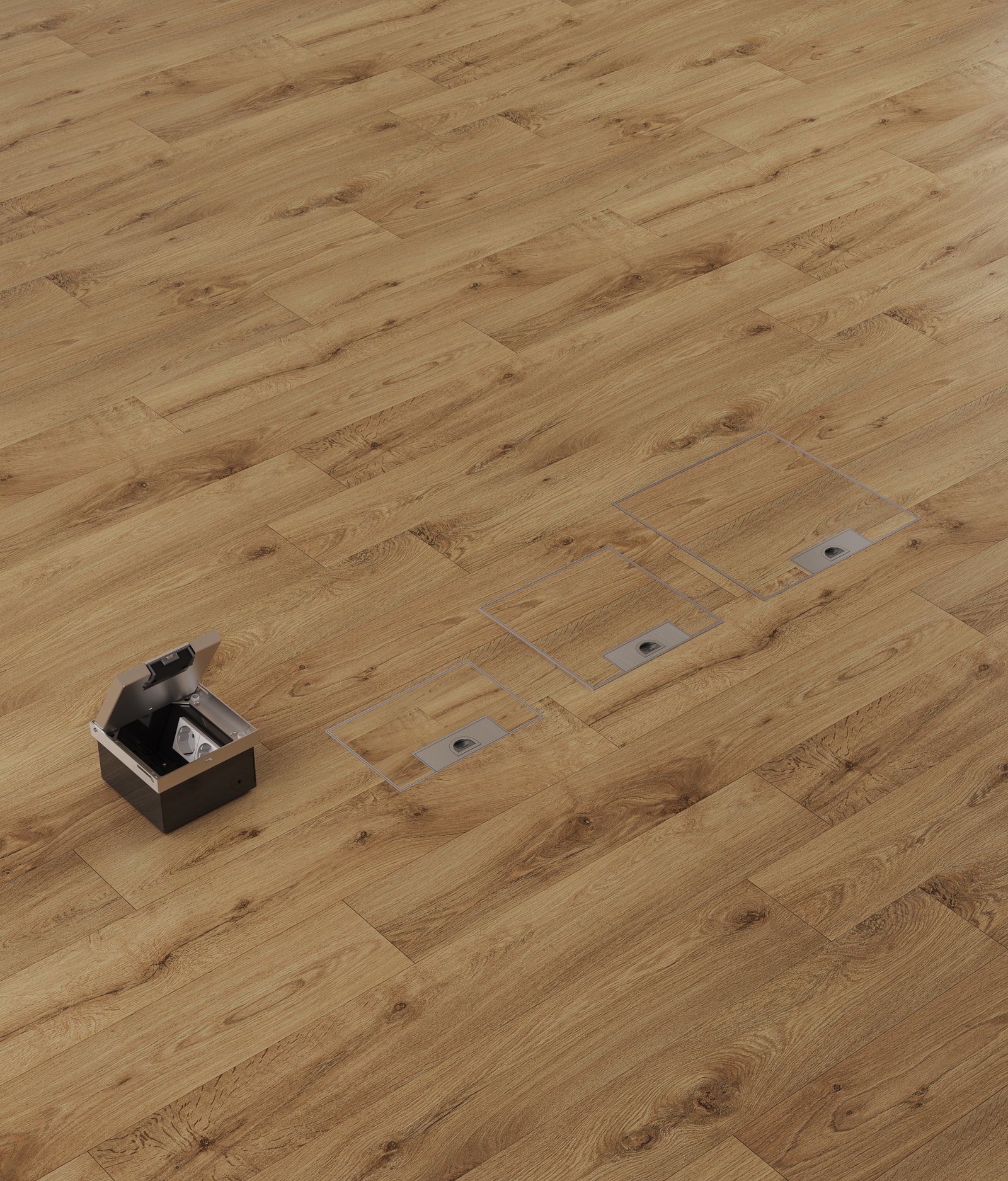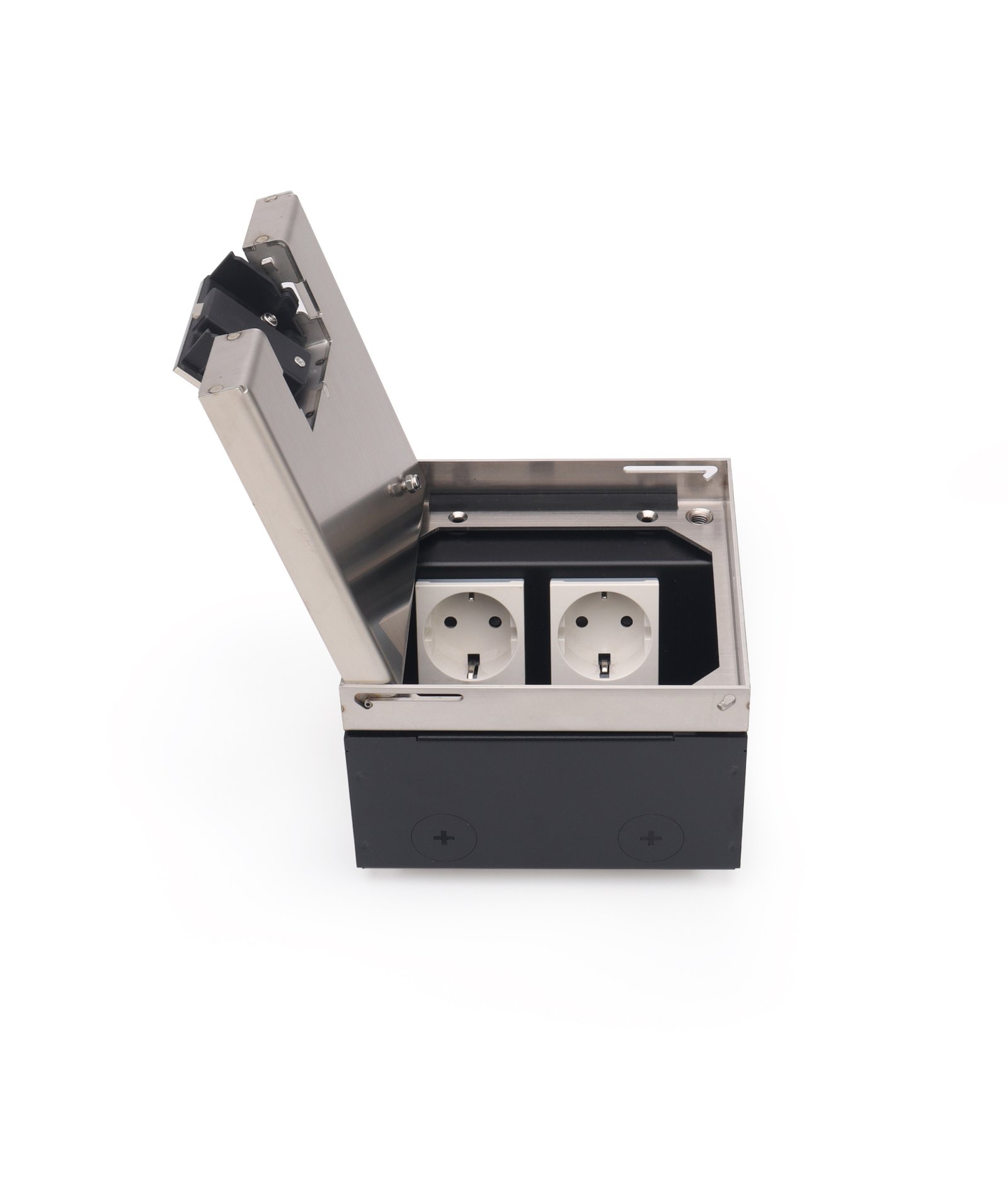 The height-adjustable floor box can be precisely aligned with the finished floor surface, ensuring a seamless flush installation. Its lid can be fully detached from the outer frame for easy access. The integrated cord outlet provides reliable protection for cable exits, even in areas subject to dry or damp cleaning. With its complete flush design, this floor box discreetly supports the installation of power, data, and multimedia modules, making it an ideal choice for modern and professional environments.