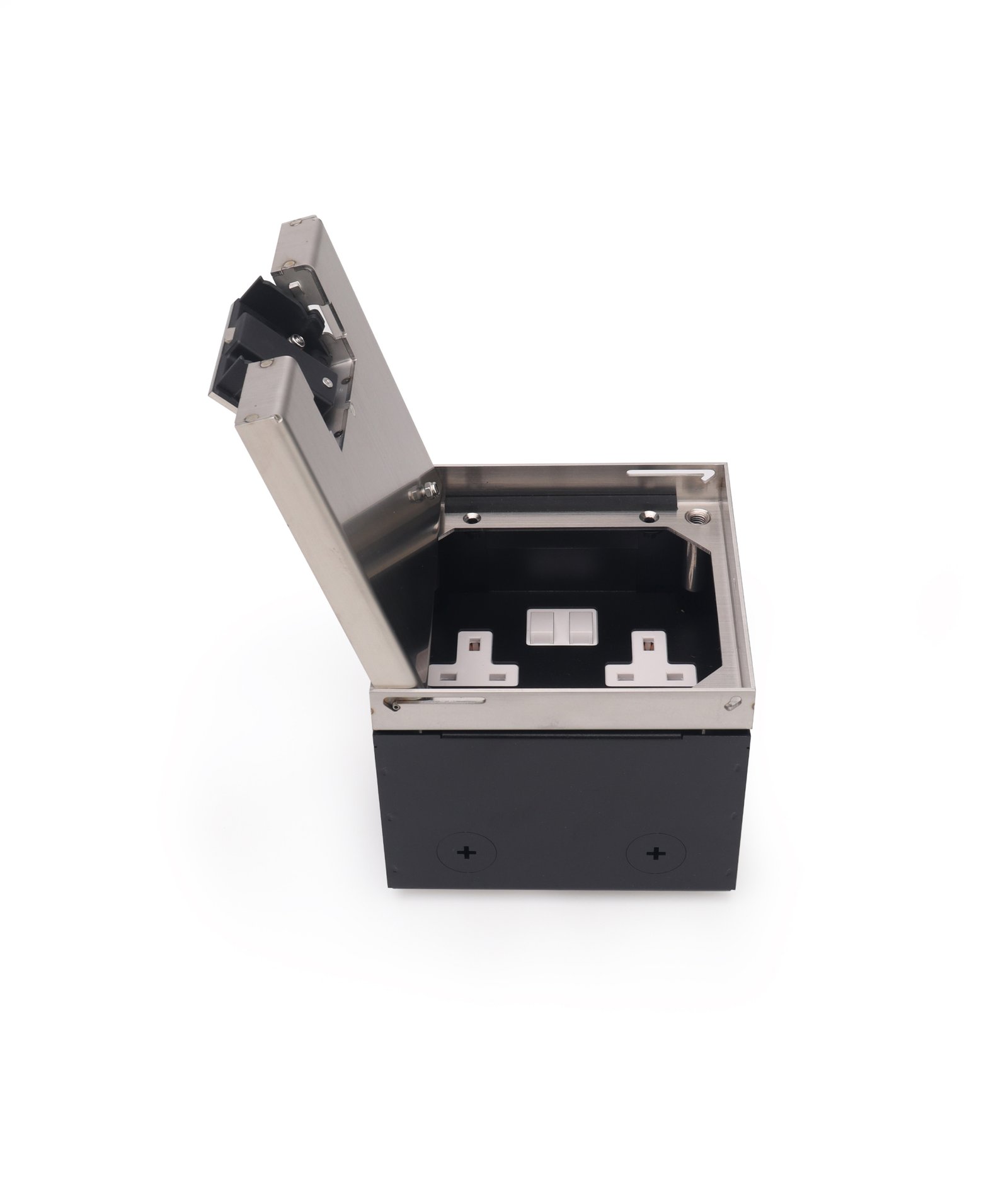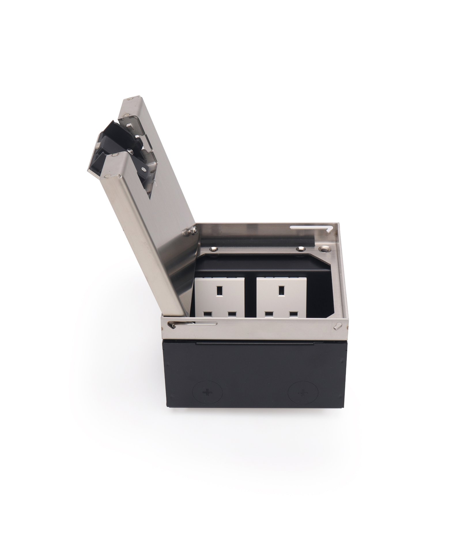 The height-adjustable floor box can be precisely aligned with the finished floor surface, ensuring a seamless flush installation. Its lid can be fully detached from the outer frame for easy access. The integrated cord outlet provides reliable protection for cable exits, even in areas subject to dry or damp cleaning. With its complete flush design, this floor box discreetly supports the installation of power, data, and multimedia modules, making it an ideal choice for modern and professional environments.