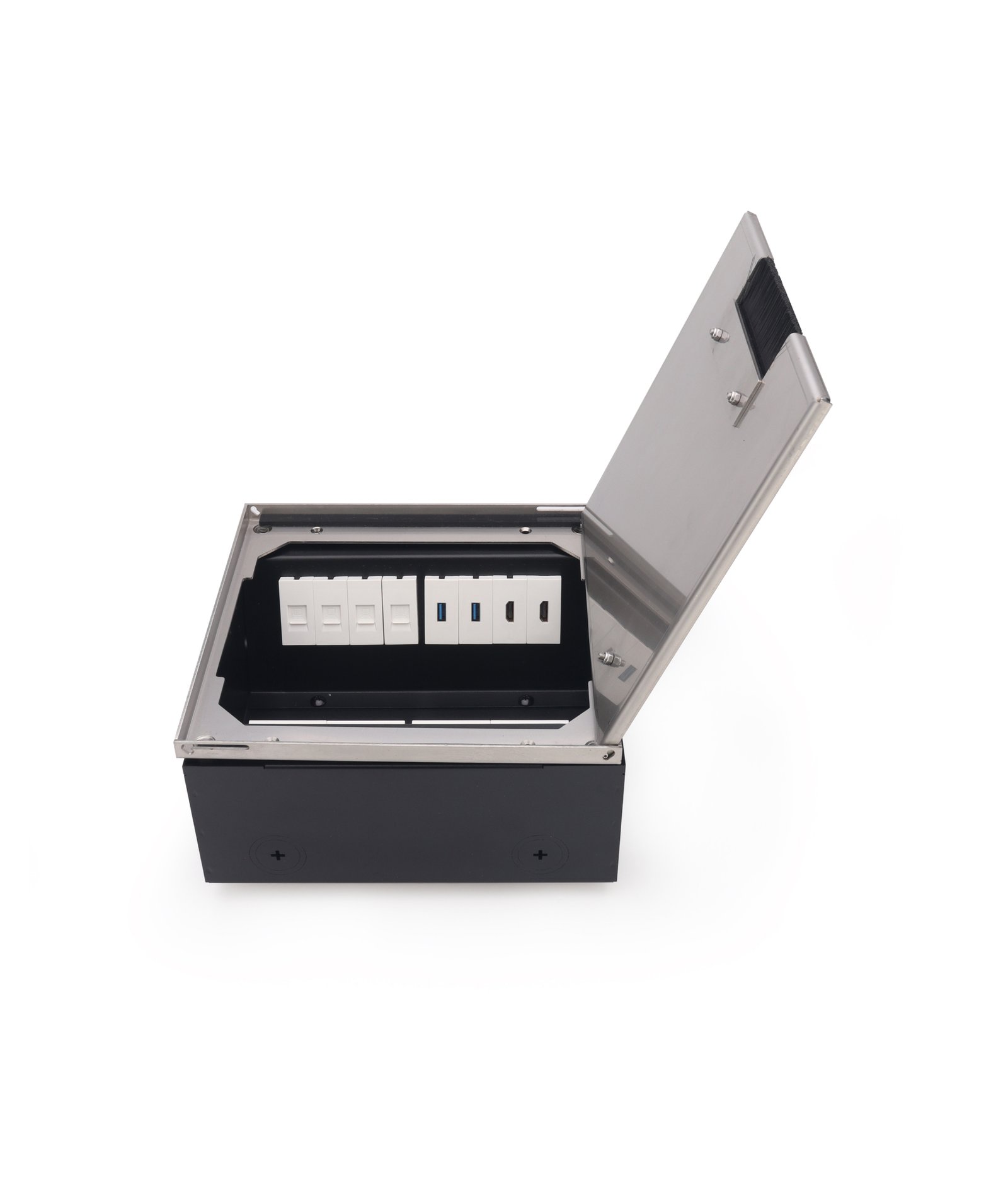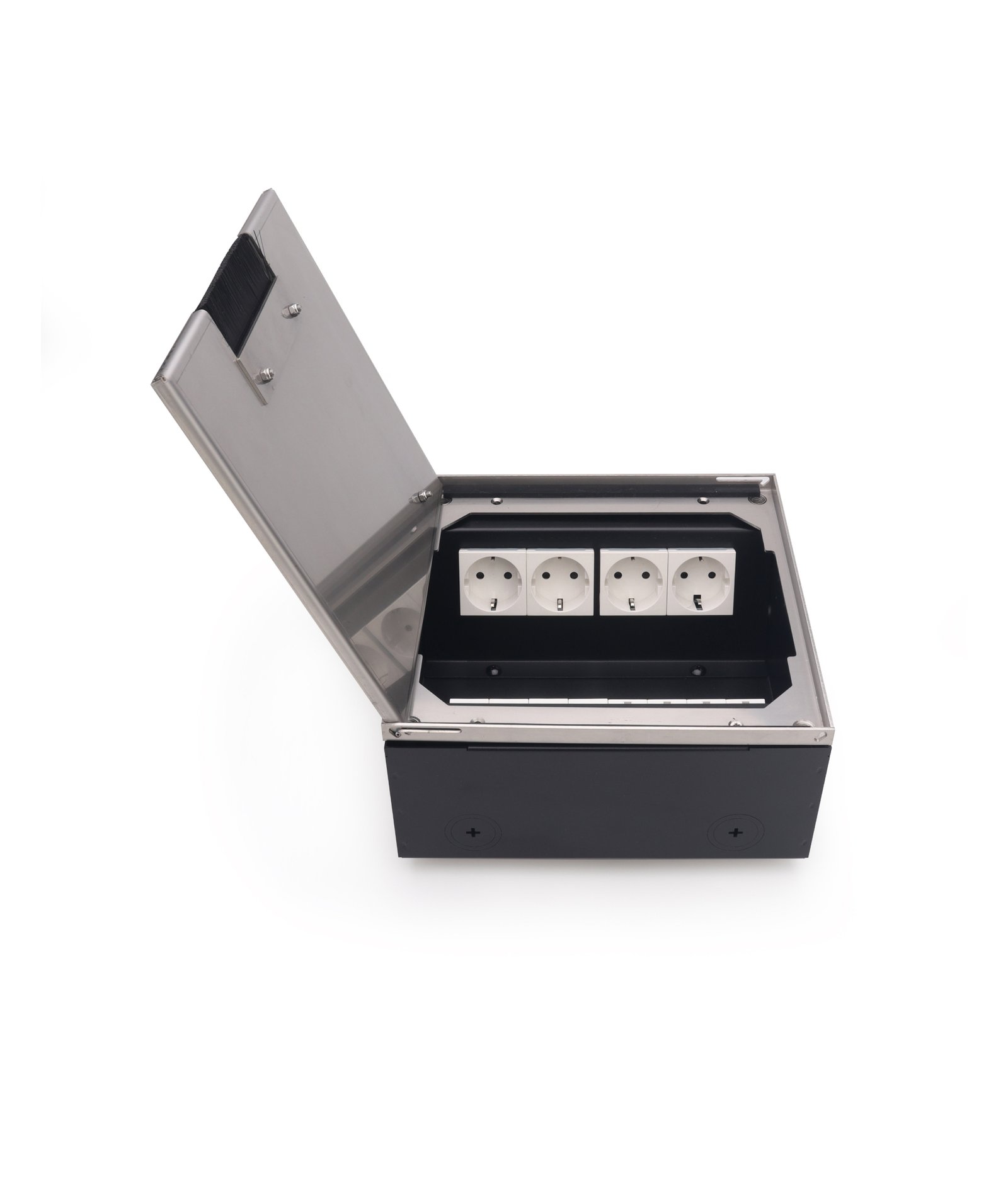 The height-adjustable floor box can be precisely aligned with the finished floor surface, ensuring a seamless flush installation. Its lid can be fully detached from the outer frame for easy access. With its complete flush design, this floor box discreetly supports the installation of power, data, and multimedia modules, making it an ideal choice for modern and professional environments.