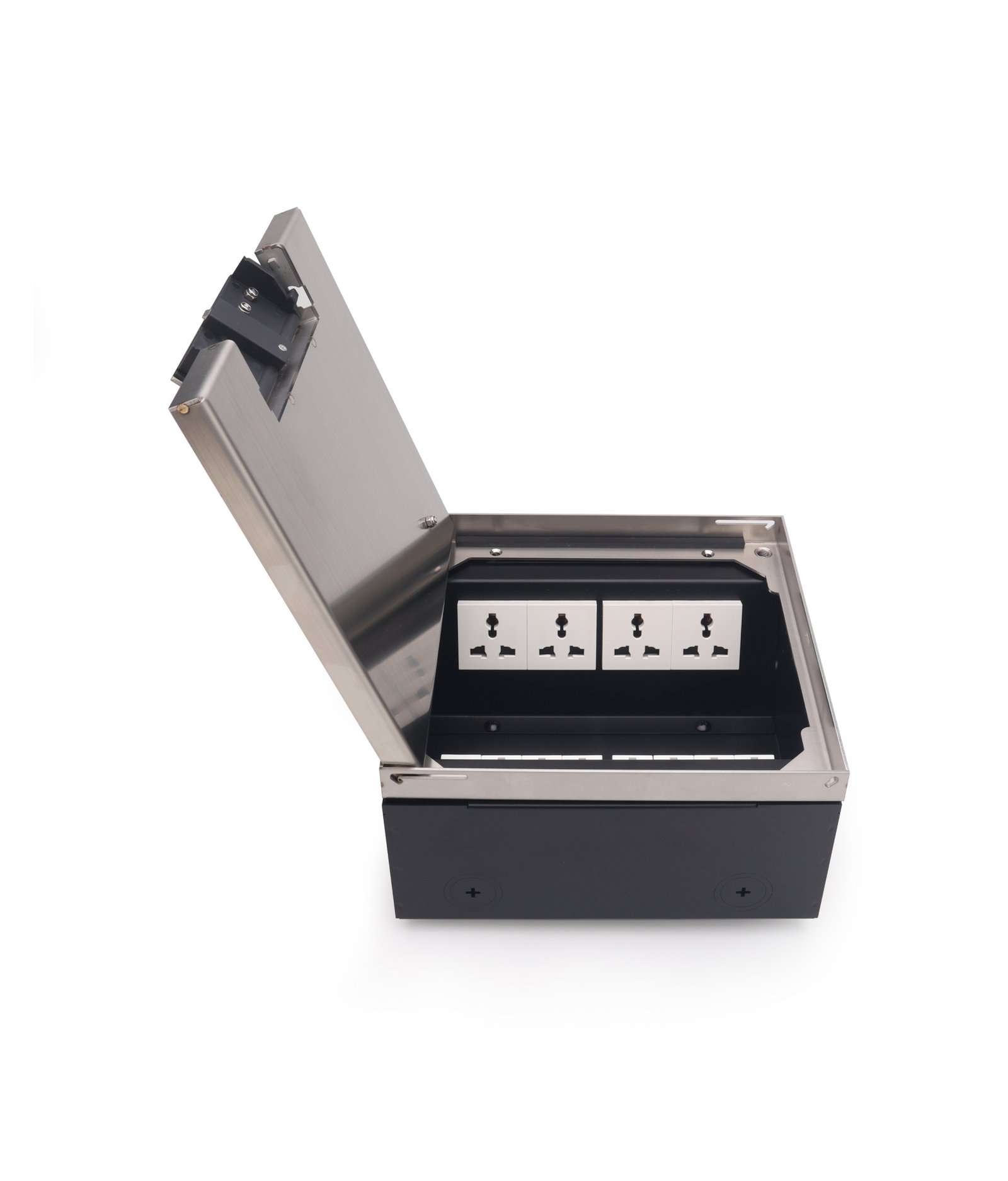 The height-adjustable floor box can be precisely aligned with the finished floor surface, ensuring a seamless flush installation. Its lid can be fully detached from the outer frame for easy access. The integrated cord outlet provides reliable protection for cable exits, even in areas subject to dry or damp cleaning. With its complete flush design, this floor box discreetly supports the installation of power, data, and multimedia modules, making it an ideal choice for modern and professional environments.