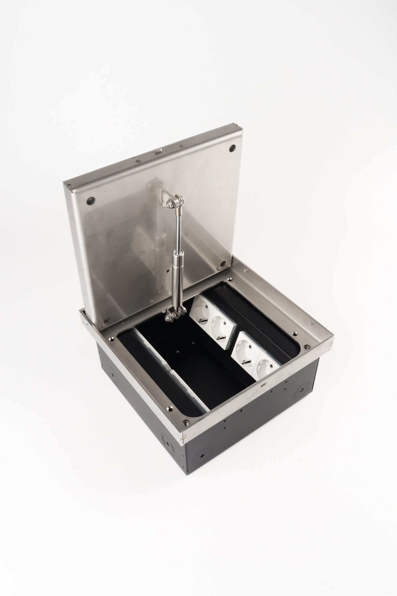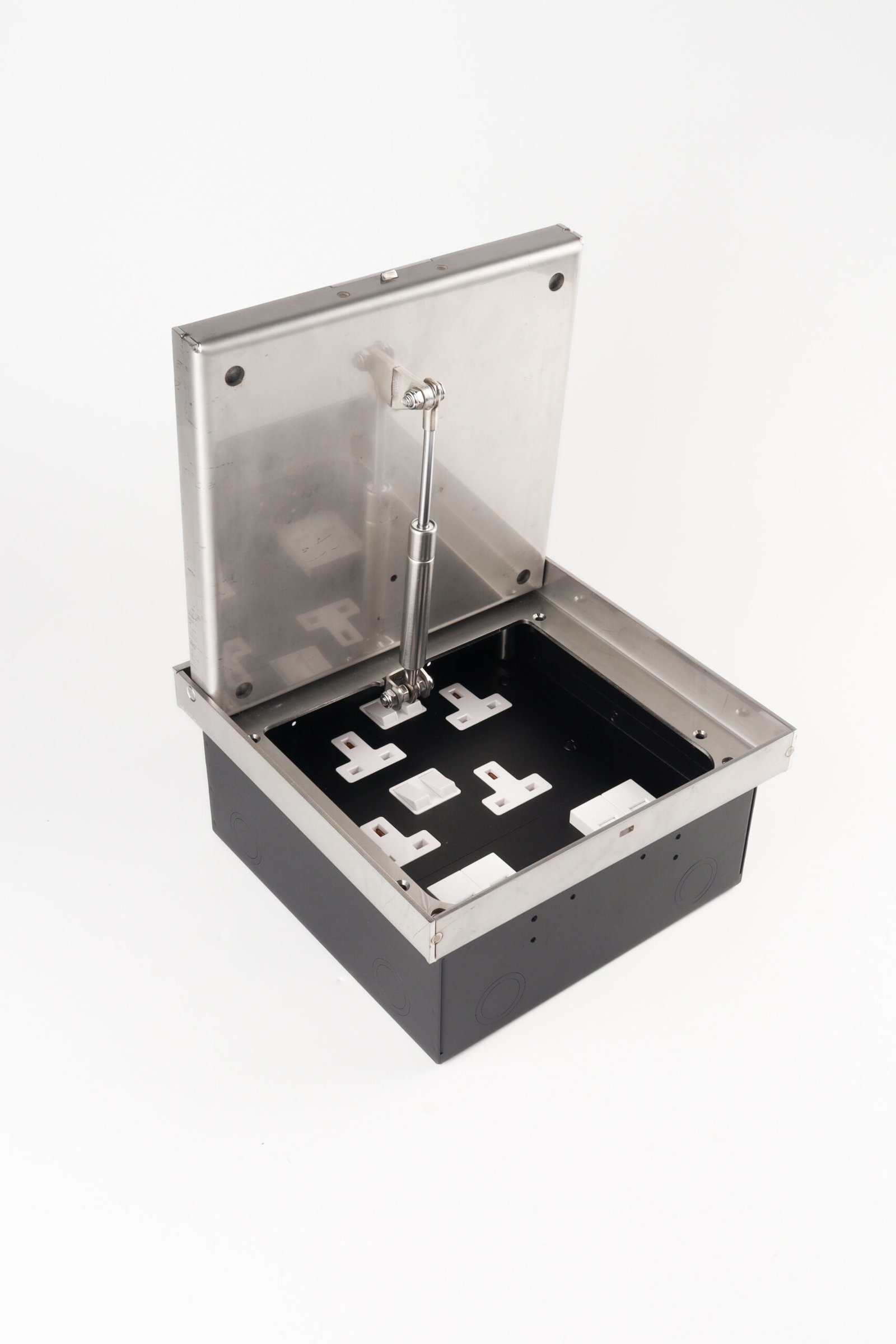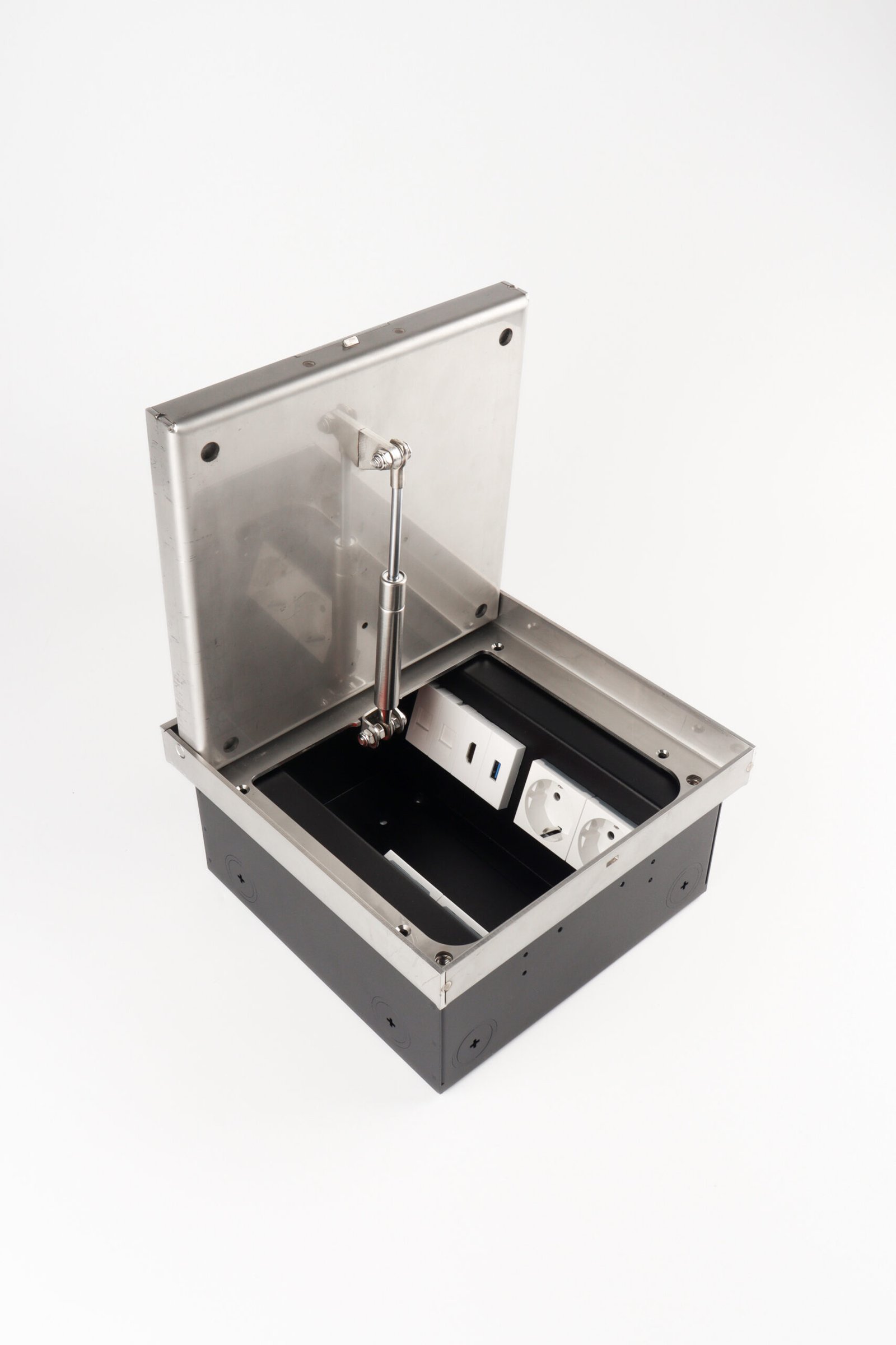 The height adjustable heavy duty floor box can be mounted in a minimum installation depth of l25 mm in screed floor as well as in raised and cavity floors, 3mm stainless steel provides the necessary stability , heavy traffic load is not a problem. lid can be soft closing or stay-open at any angle ensures the safety.