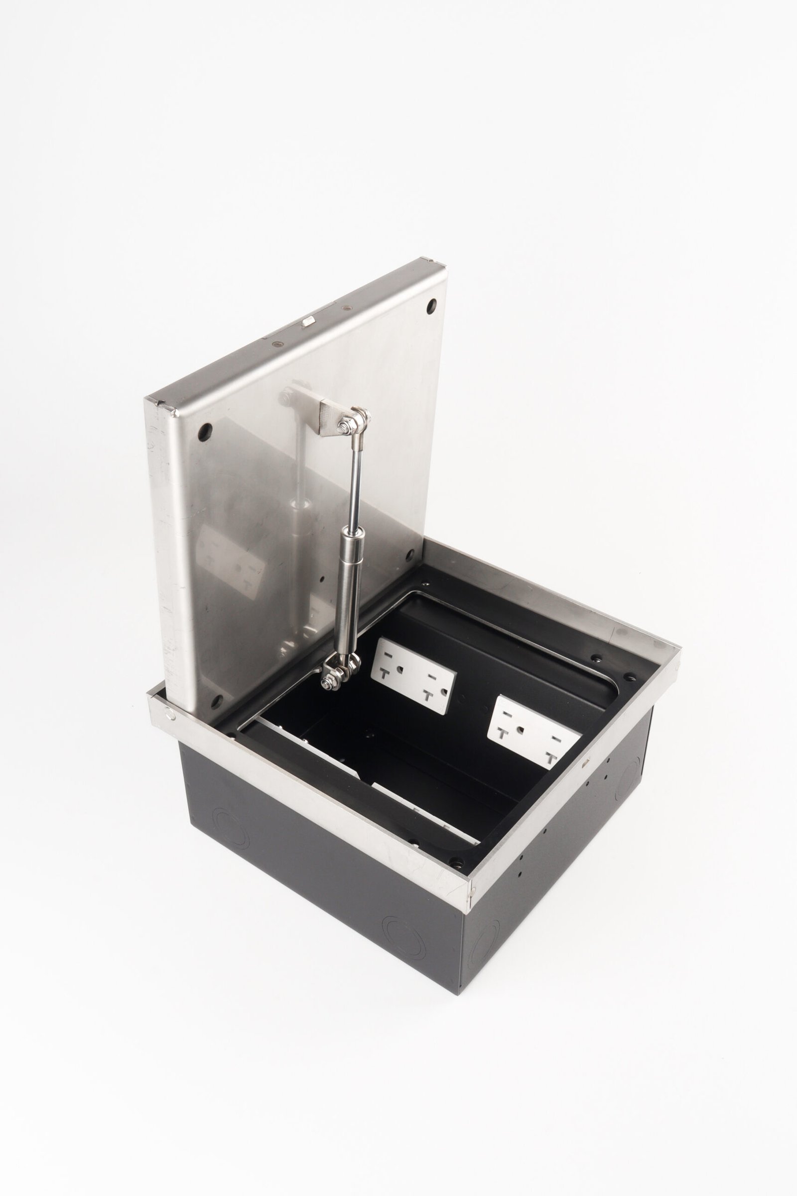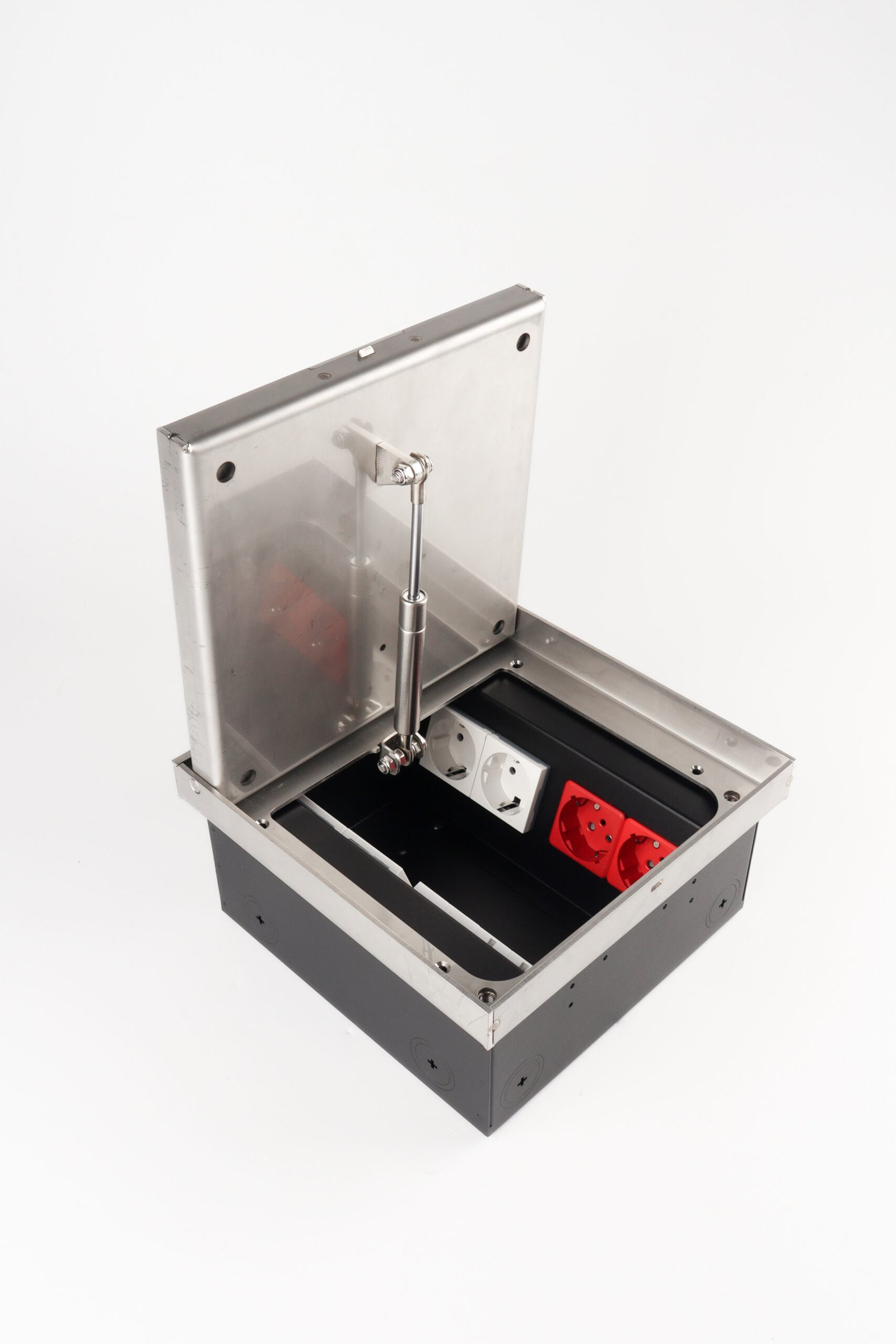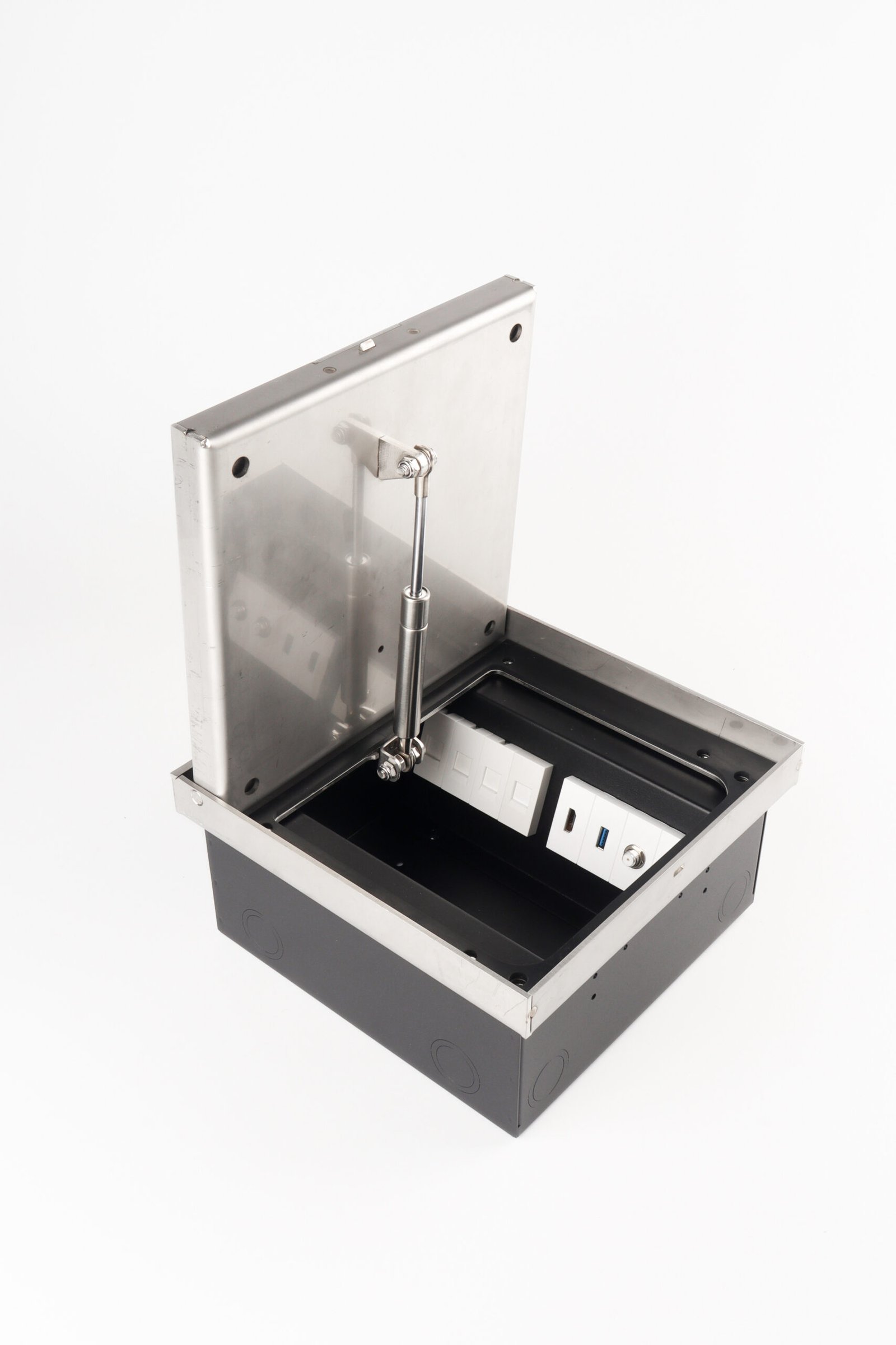 The height adjustable heavy duty floor box can be mounted in a minimum installation depth of l25 mm in screed floor as well as in raised and cavity floors, 3mm stainless steel provides the necessary stability , heavy traffic load is not a problem. lid can be soft closing or stay-open at any angle ensures the safety.