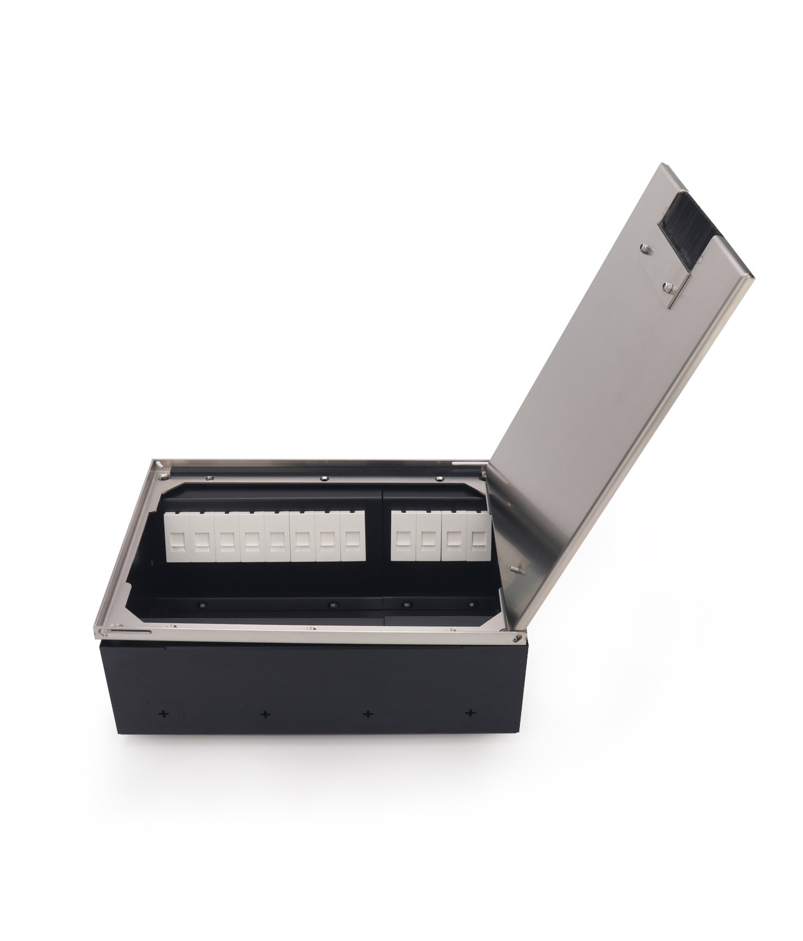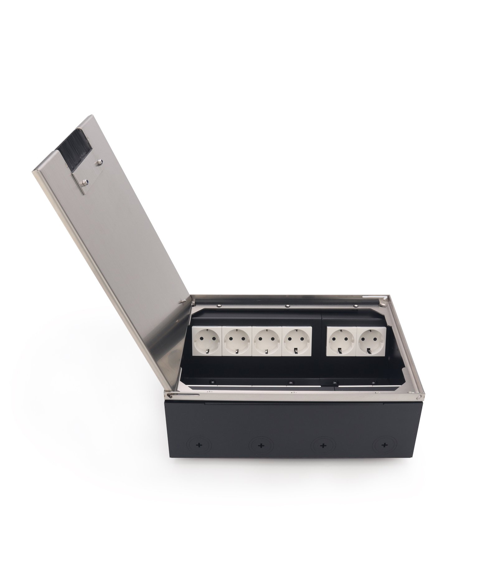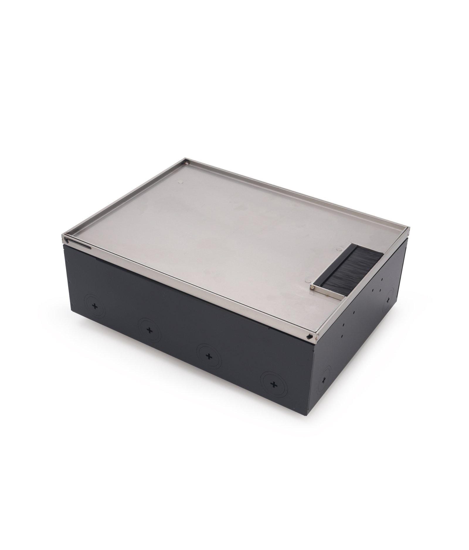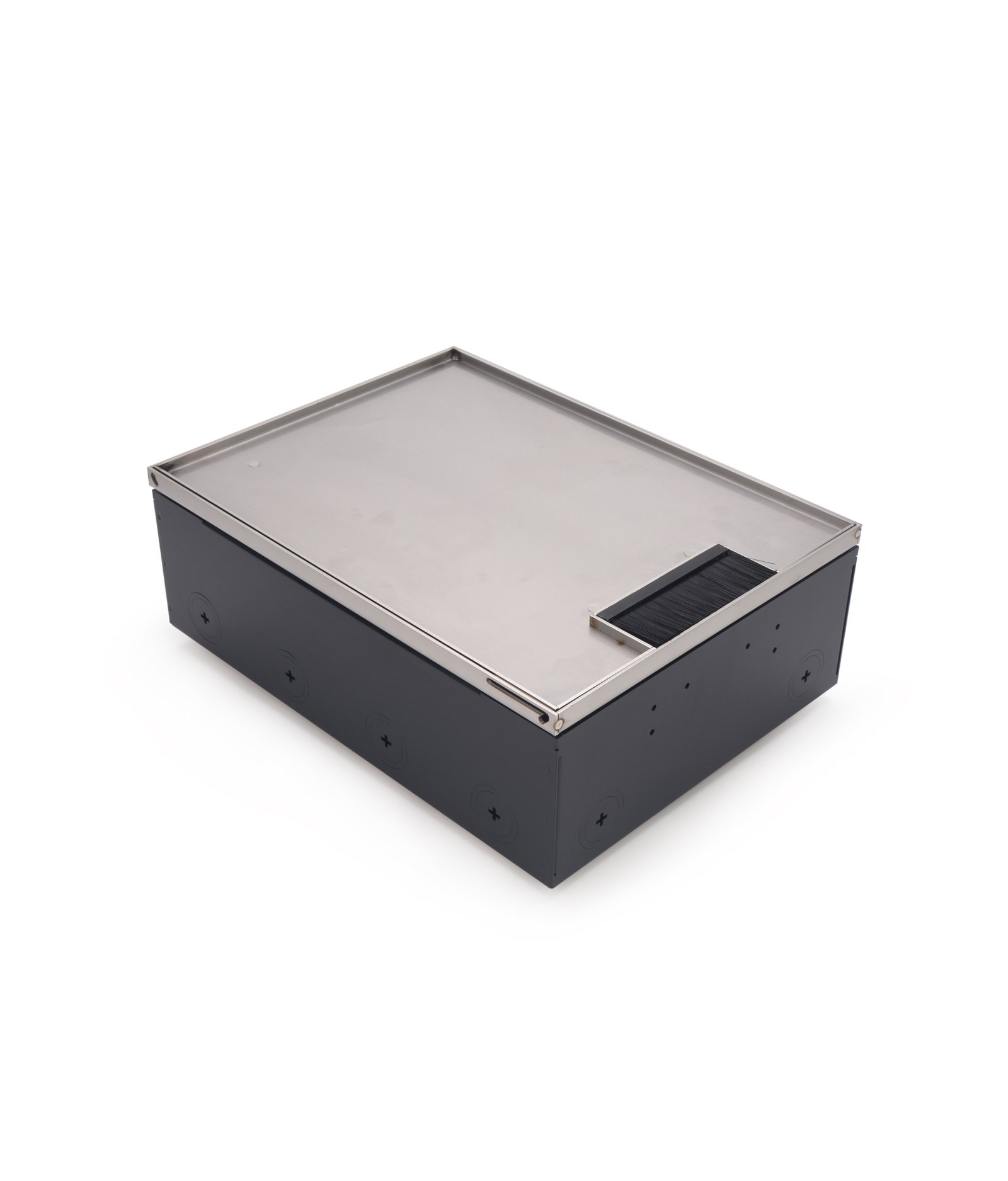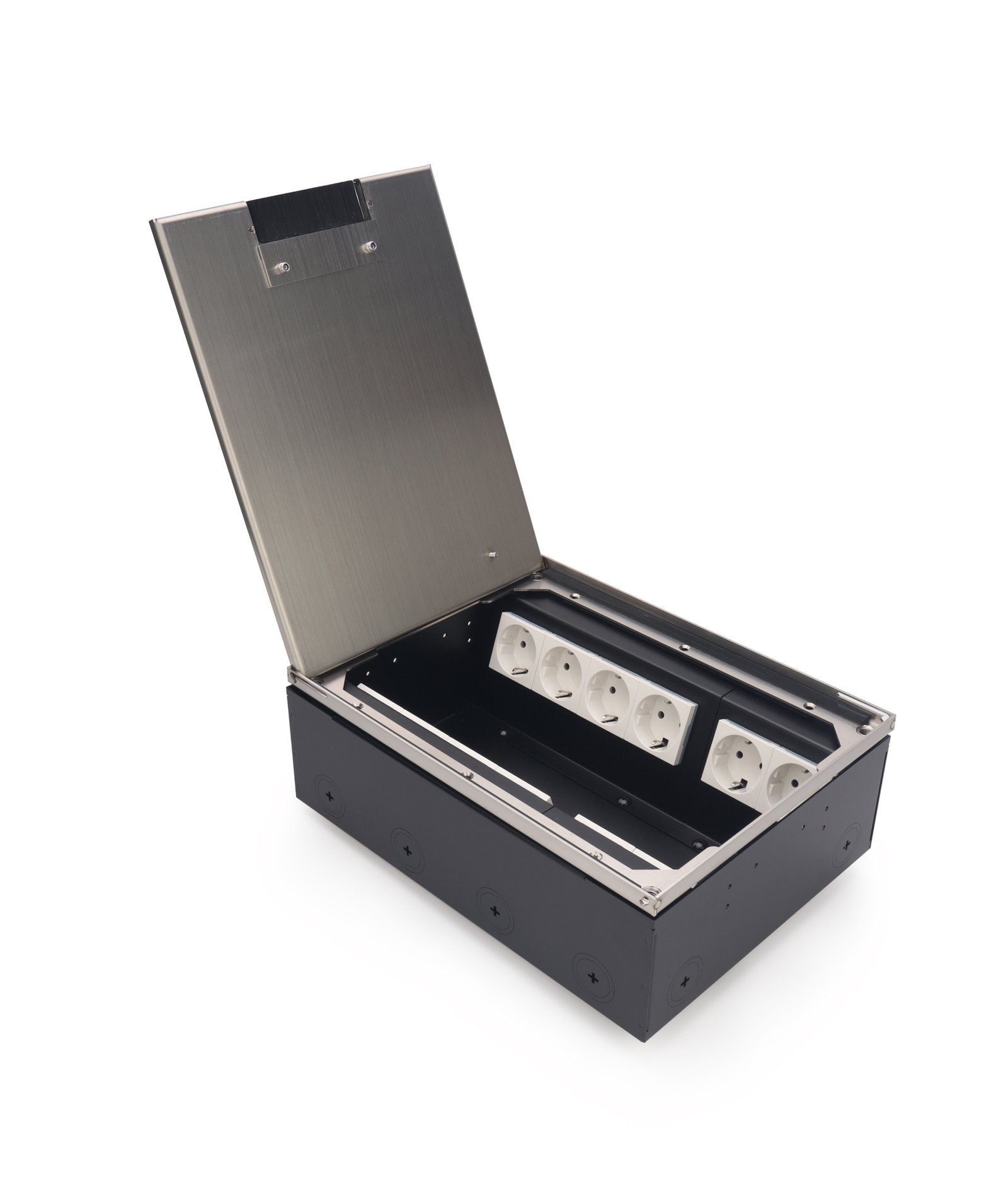 The height-adjustable floor box can be precisely aligned with the finished floor surface, ensuring a seamless flush installation. Its lid can be fully detached from the outer frame for easy access. With its complete flush design, this floor box discreetly supports the installation of power, data, and multimedia modules, making it an ideal choice for modern and professional environments.