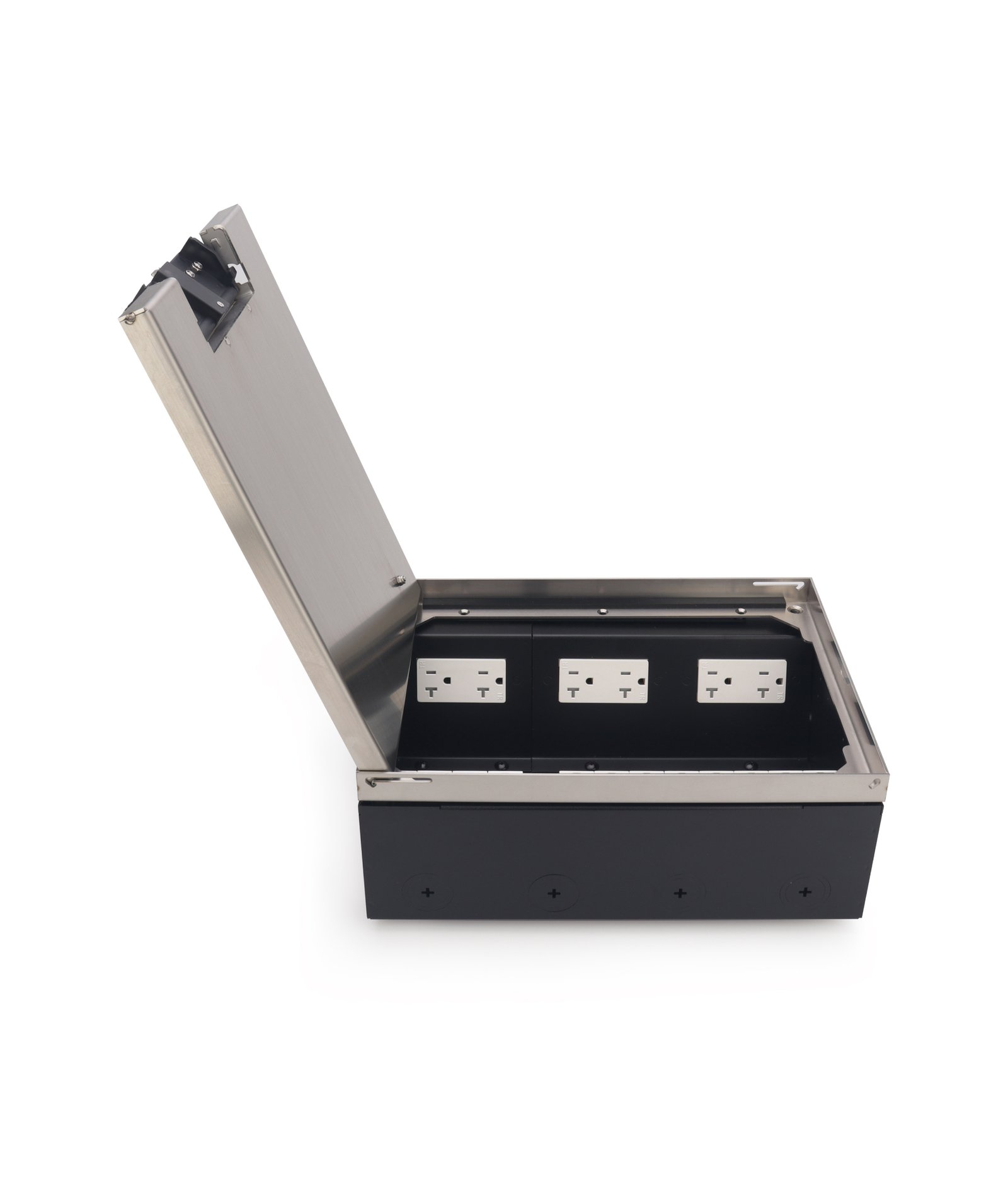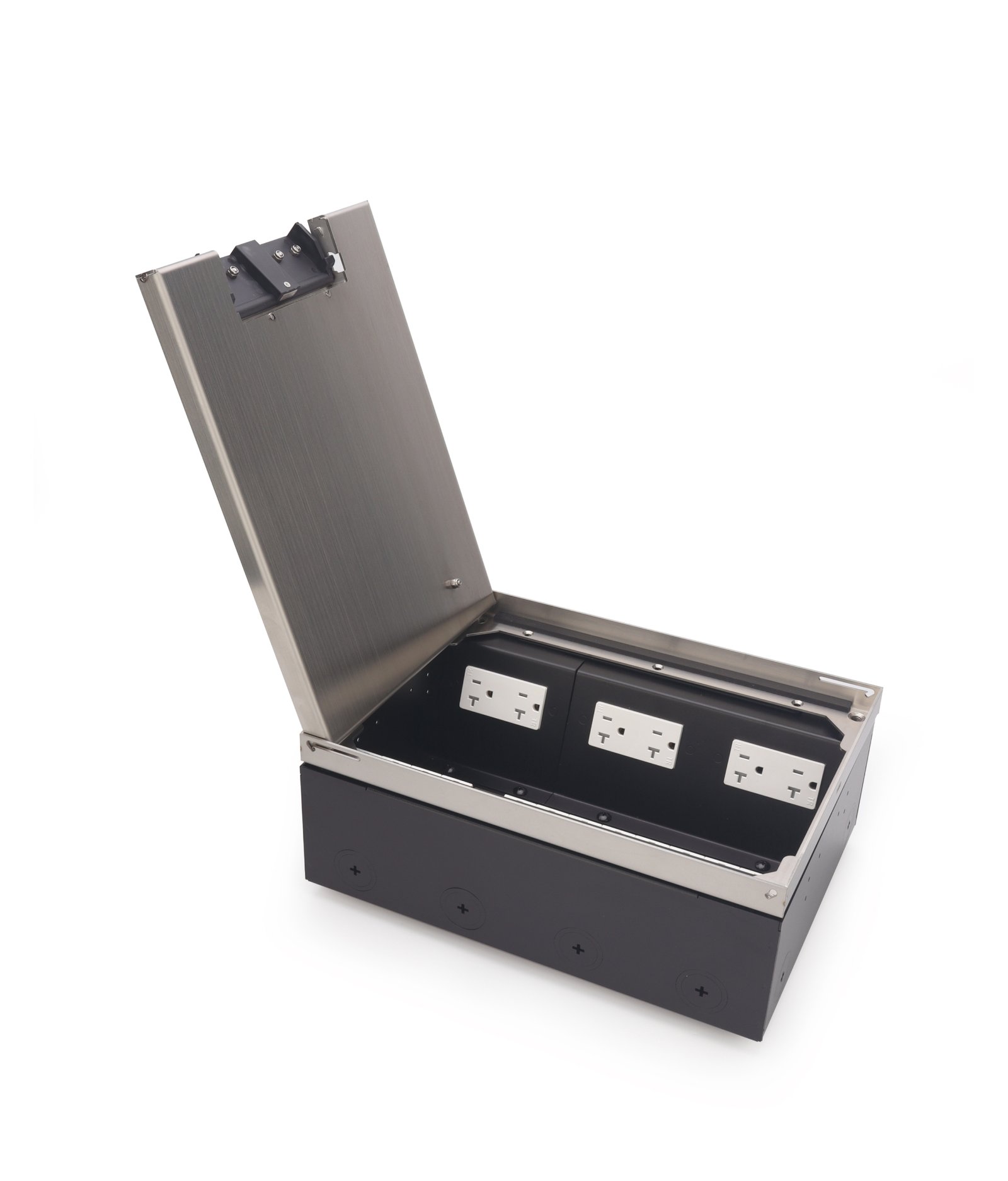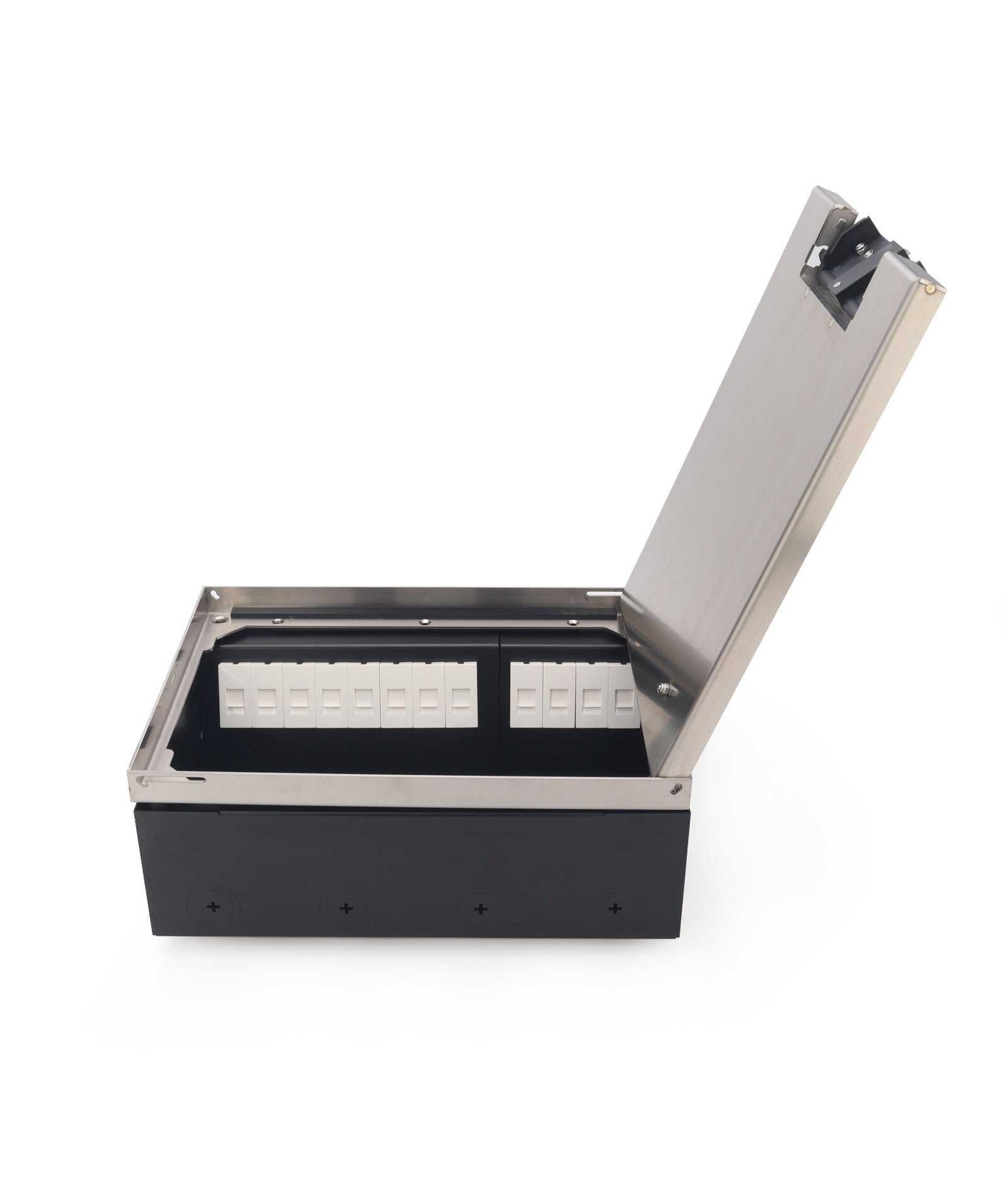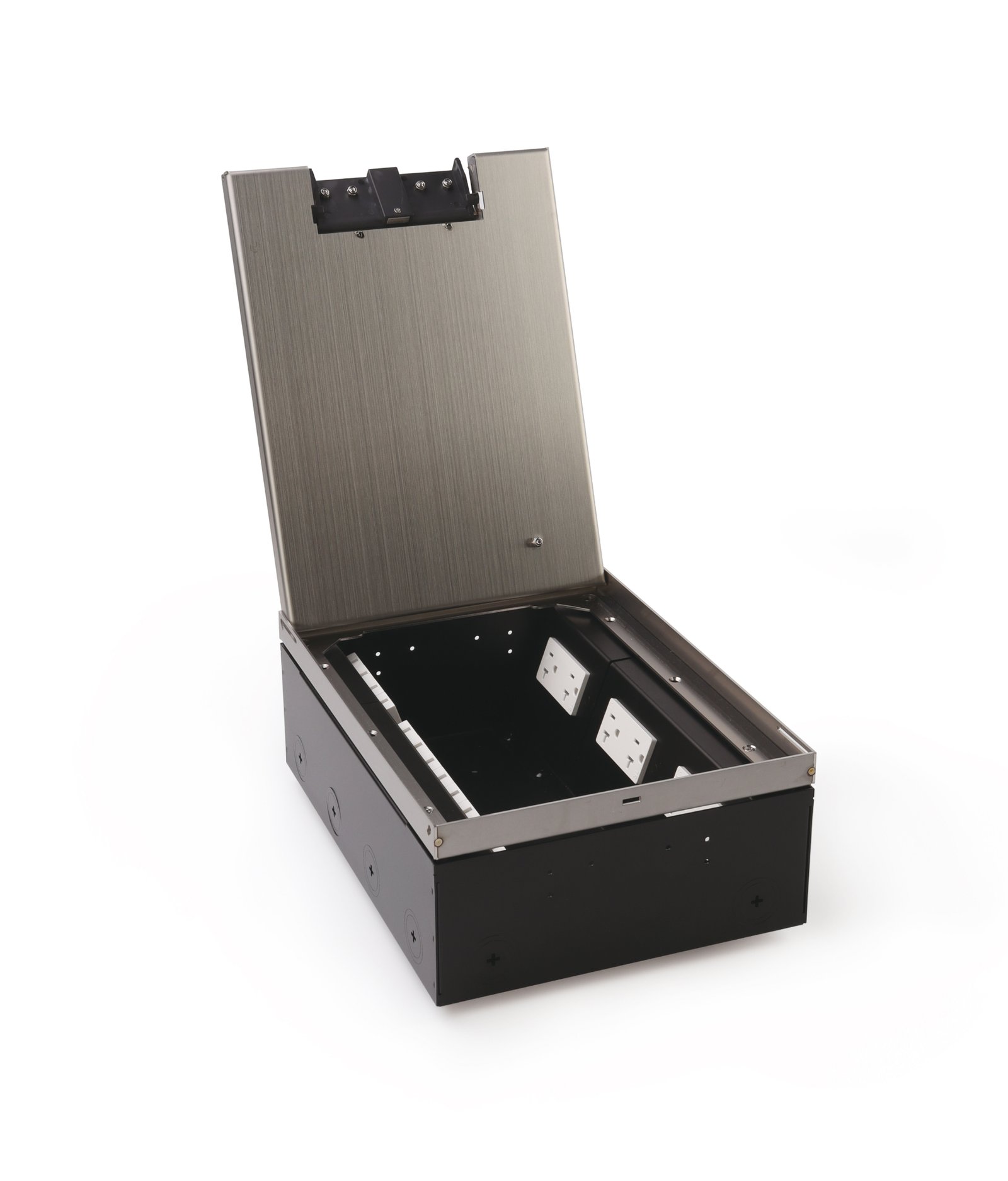 The height-adjustable floor box can be precisely aligned with the finished floor surface, ensuring a seamless flush installation. Its lid can be fully detached from the outer frame for easy access. The integrated cord outlet provides reliable protection for cable exits, even in areas subject to dry or damp cleaning. With its complete flush design, this floor box discreetly supports the installation of power, data, and multimedia modules, making it an ideal choice for modern and professional environments.