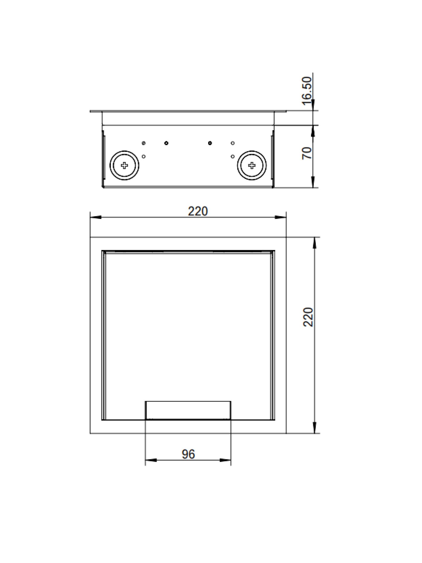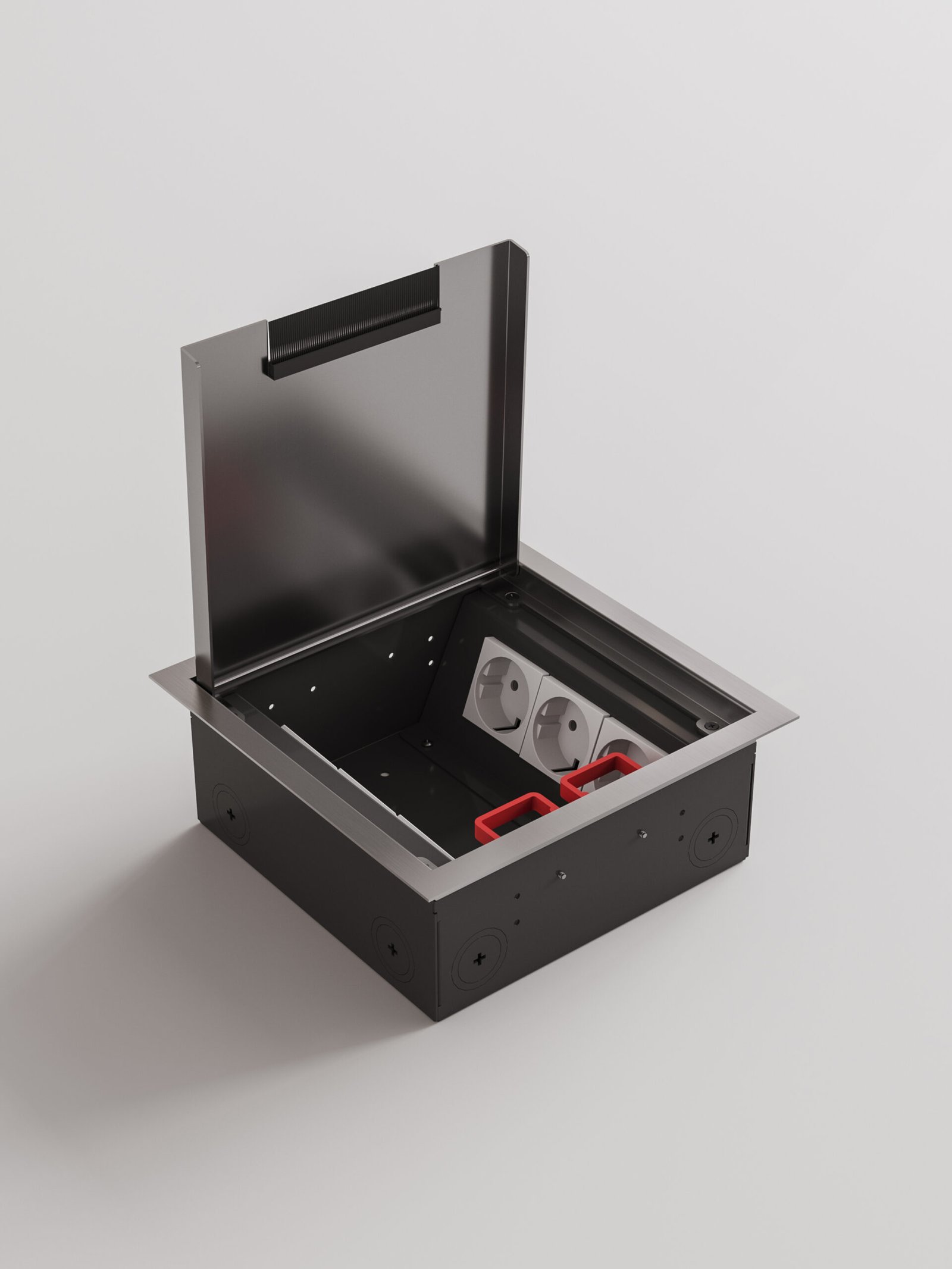 This floor box features a U-shaped cable outlet and a lid designed to sit completely flush with the floor surface. The lid is made of durable stainless steel, while the box body is constructed from powder-coated galvanized steel for excellent strength and corrosion resistance. Specially designed for raised flooring systems, it comes with edge support flanges that ensure secure installation and stability. With its sleek appearance and reliable performance, this floor box is an ideal choice for modern offices, data centers, and commercial spaces requiring discreet yet functional power and data access.